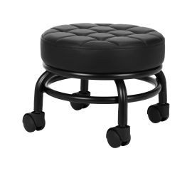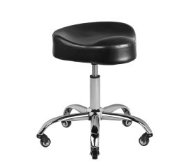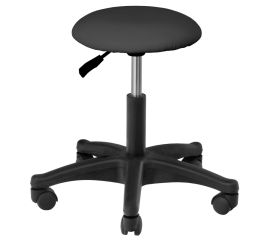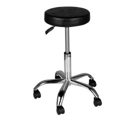 Comfortable cosmetic stool made of ecological leather. A stable structure set on a four-armed base, with plastic wheels, available in black.