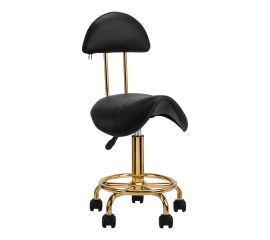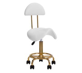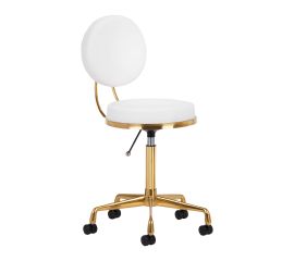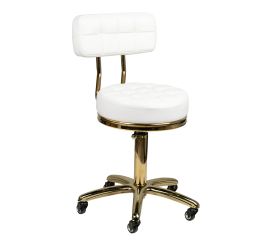 Comfortable, stable cosmetic stool with a backrest, with a profiled seat, gold-colored metal elements. On a five-star base with plastic wheels. Available in white, a necessary piece of furniture in a beauty salon. Lacquered metal surfaces. Gold elements are coated with lacquer. Mechanical...