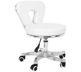 comfortable cosmetic stool made of ecological leather. stable structure set on a five-star base, with plastic wheels, available in white.  hydraulically controlled height. a necessary piece of furniture in every beauty salon. technical data: - seat width - 40cm...