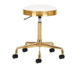 Durability and usability This golden stool has a comfortable white seat covered with ecological leather. It is supported by a stable five-leg base. Made of metal alloys, it is durable and resistant to damage. The seat height is efficiently regulated. Plastic wheels allow you to easily...