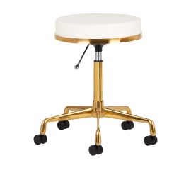 Durability and usability This golden stool has a comfortable white seat covered with ecological leather. It is supported by a stable five-leg base. Made of metal alloys, it is durable and resistant to damage. The seat height is efficiently regulated. Plastic wheels allow you to easily...