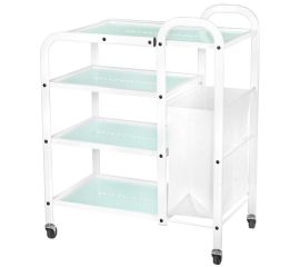 functional metal and glass table on rubber wheels. the table has four glass shelves with an engraved giovanni logo. an additional advantage of the table is a bag for dirty towels and cosmetic bands attached to it.  technical data: - metal structure, - 4 glass shelves - wheels 4 pcs -...