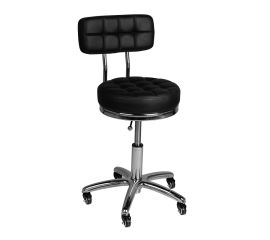 black cosmetic stool with a quilted seat and a comfortable backrest. it is height-adjustable and the arm-like base is equipped with solid metal-rubber wheels.