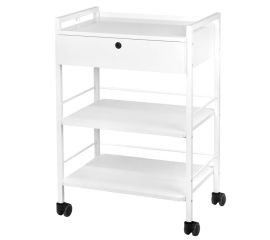 aesthetic and functional metal and wooden table by Giovanni, with one wooden drawer locked with a key and two wooden shelves. the upper part of the drawer also serves as a shelf. the table has four wheels. table available in white.  table 1019a has the option of attaching a magnifying lamp....
