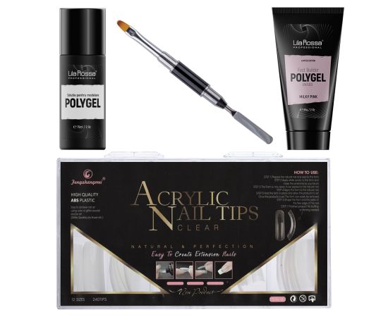 Kit Polygel Premium Milky Pink, πινέλο Lila Rossa, μύτες, υγρό μοντελοποίησης, Fast Builder Polygel 60g