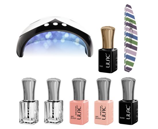 - Απλώστε μια στρώση ημιμόνιμο βερνίκι νυχιών Lilac, πολυμερίστε 60/120 δευτερόλεπτα στη λάμπα LED/UV.