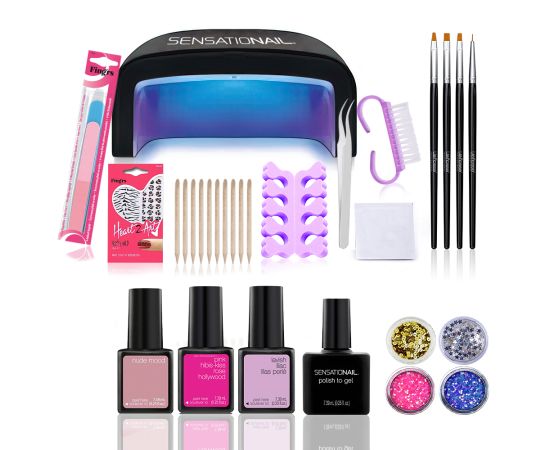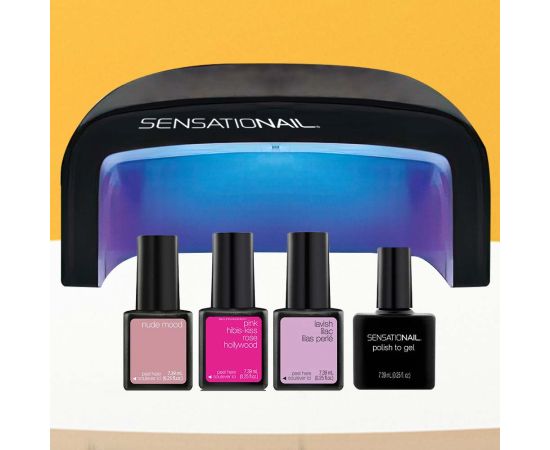 Ημιμόνιμο κιτ βερνικιών νυχιών Starter Essential 3 με γωνιακή λάμπα led, 3 ημιμόνιμα βερνίκια νυχιών, top coat, αξεσουάρ νυχιών Sensationail