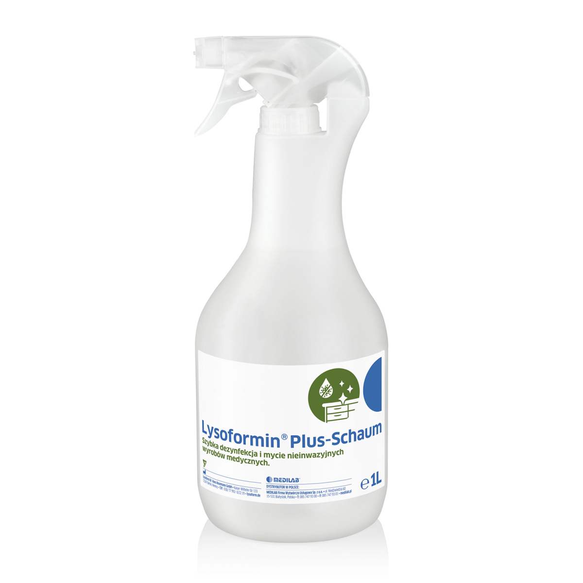 - high material compatibility - especially recommended for disinfecting and washing surfaces sensitive to alcohol, e.g. armchairs, treatment beds, cables, massage belts and beds, incubators, acrylic baths, worktops, etc.
