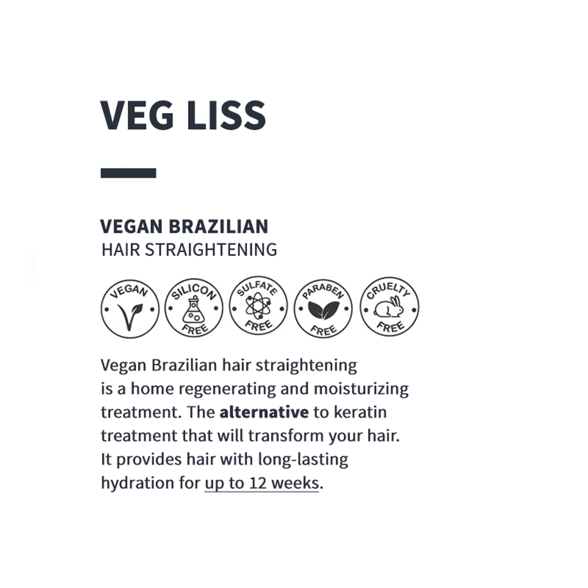 ALTERLOOK PROFESSIONAL VEG LISS Vegan Brazilian hair straightening is a home regenerating and moisturizing treatment. Thanks to its unique plant formula, it provides hair with long-lasting hydration for up to 12 weeks.