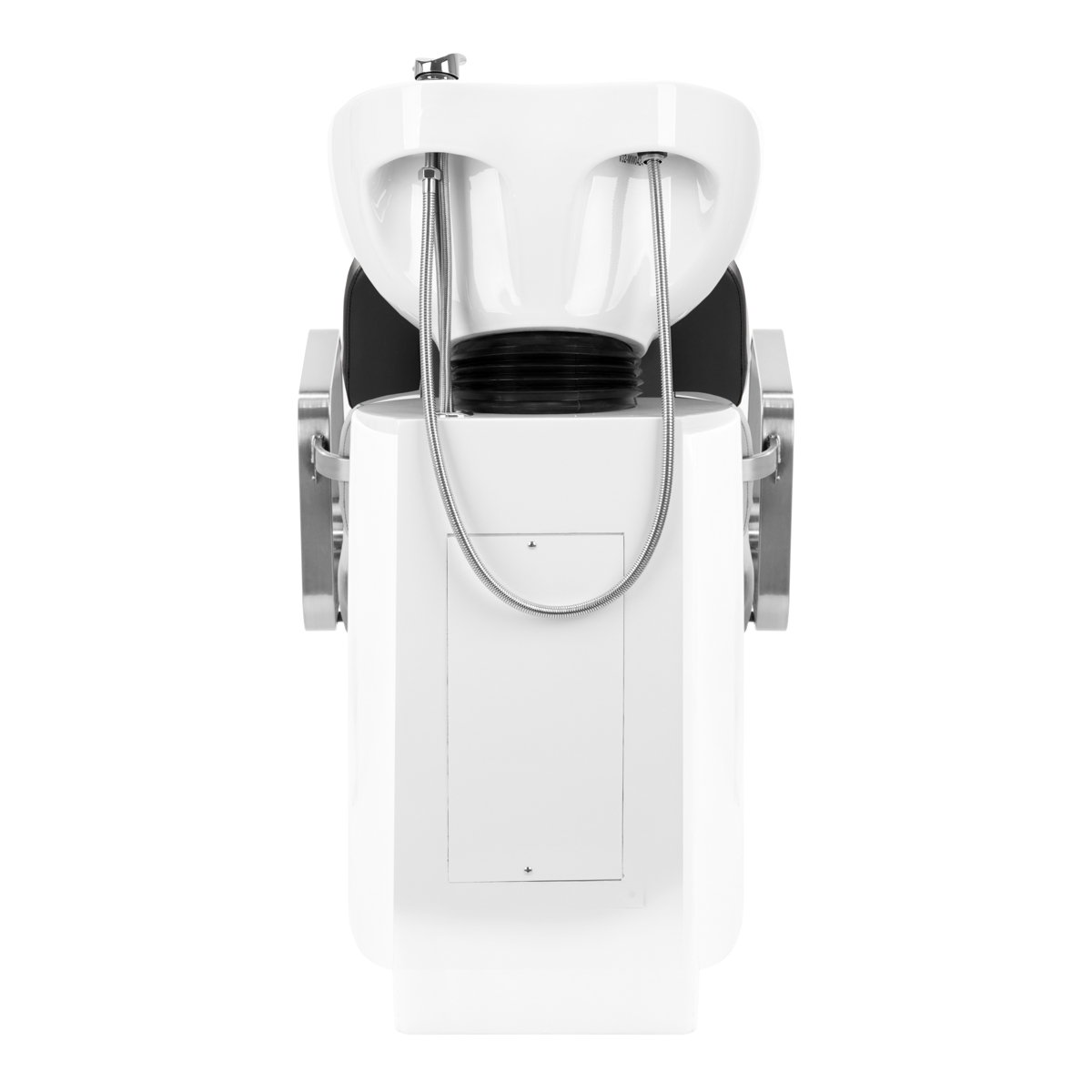 The practical hair wash unit is equipped with a mixer faucet, which provides easy access to hot and cold water. This makes it easier to adjust the temperature to the customer's individual preferences. A dedicated place to hang up the handset makes work easier, and the chrome-plated plug with a special strainer allows you to control the water flow and maintain high hygiene standards in the salon. The water connection has been placed inside the base, allowing the pipes to be easily hidden. A significant advantage of this model is the opening left between the backrest and the seat, which makes it easier to keep the living room clean by allowing you to easily sweep dirt from every nook and cranny of the chair. The hair wash unit has been designed in such a way as to ensure comfort during various treatments, ensuring proper back support. The combination of functionality and amenities makes working in a hairdressing salon even more comfortable.