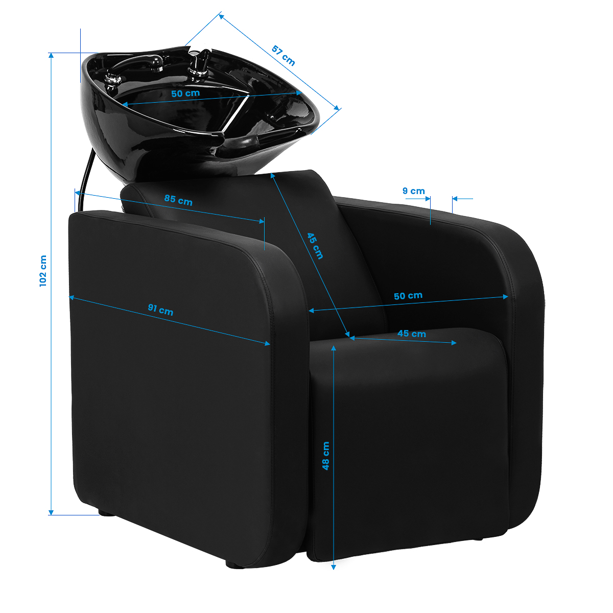 The depth of the ceramic washbasin bowl in shades of black allows for comfortable and efficient performance of a wide range of hairdressing services, preventing excessive splashing of water and products used during the treatment. The material used makes the washbasin durable, resistant to discoloration and scratches, and very easy to keep clean. The appropriately profiled collar and inclined backrest provide support and comfort while washing hair, and thanks to the comfortable plastic overlay in shades of black, the client will not feel discomfort from the cold ceramic surface.