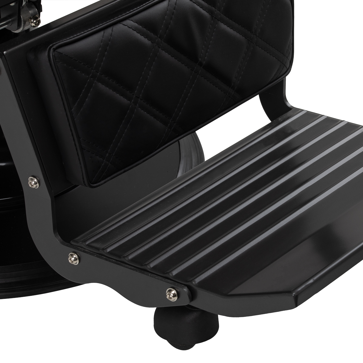 Solid construction ensures stability and high comfort of use. The seat is filled with deformation-resistant foam, and upholstery made of soft, matte synthetic leather provides the furniture with durability and comfort. Moisture-resistant materials are not only durable but also easy to clean. The black shade of upholstery gives the chair a unique character, and its elegant style fits perfectly into any barbershop decor.