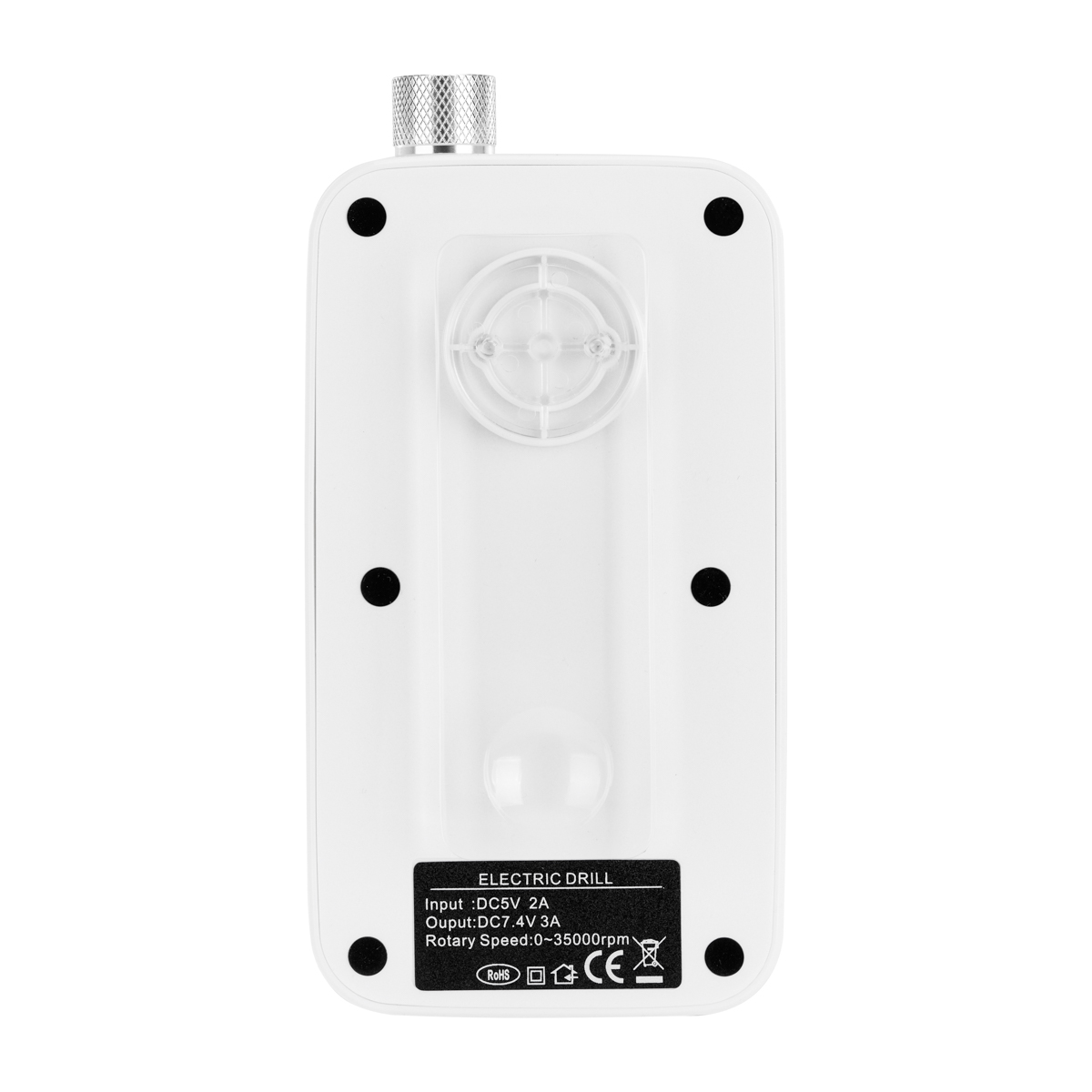 The nail drill is handy and lightweight, and its minimalist housing made of plastic in shades of white ensures durability and ease of keeping the device clean. Thanks to its compact dimensions and low weight, the device can be easily stored in small spaces and conveniently transported, which is especially important for people providing mobile services. There is a clip on the back of the housing that allows you to conveniently attach the device to your belt or other place. Additionally, non-slip elements on the bottom of the device provide greater stability during use.