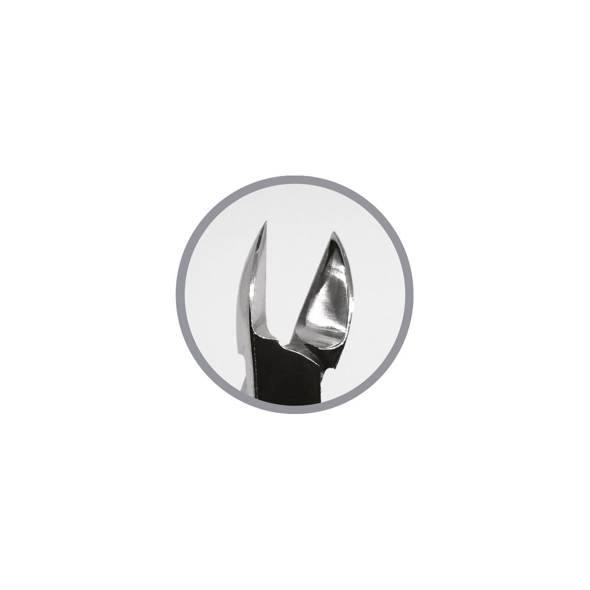 They lie very firmly in the hand, which makes the work more comfortable and safe. An additional advantage is the unsharpened tip, which makes the pliers suitable for home use. They can be used to shorten nails in children and at-risk patients. They work well both in the office and for resale. They have a two-spring, protected mechanism. Sold in a tin that protects during transport.