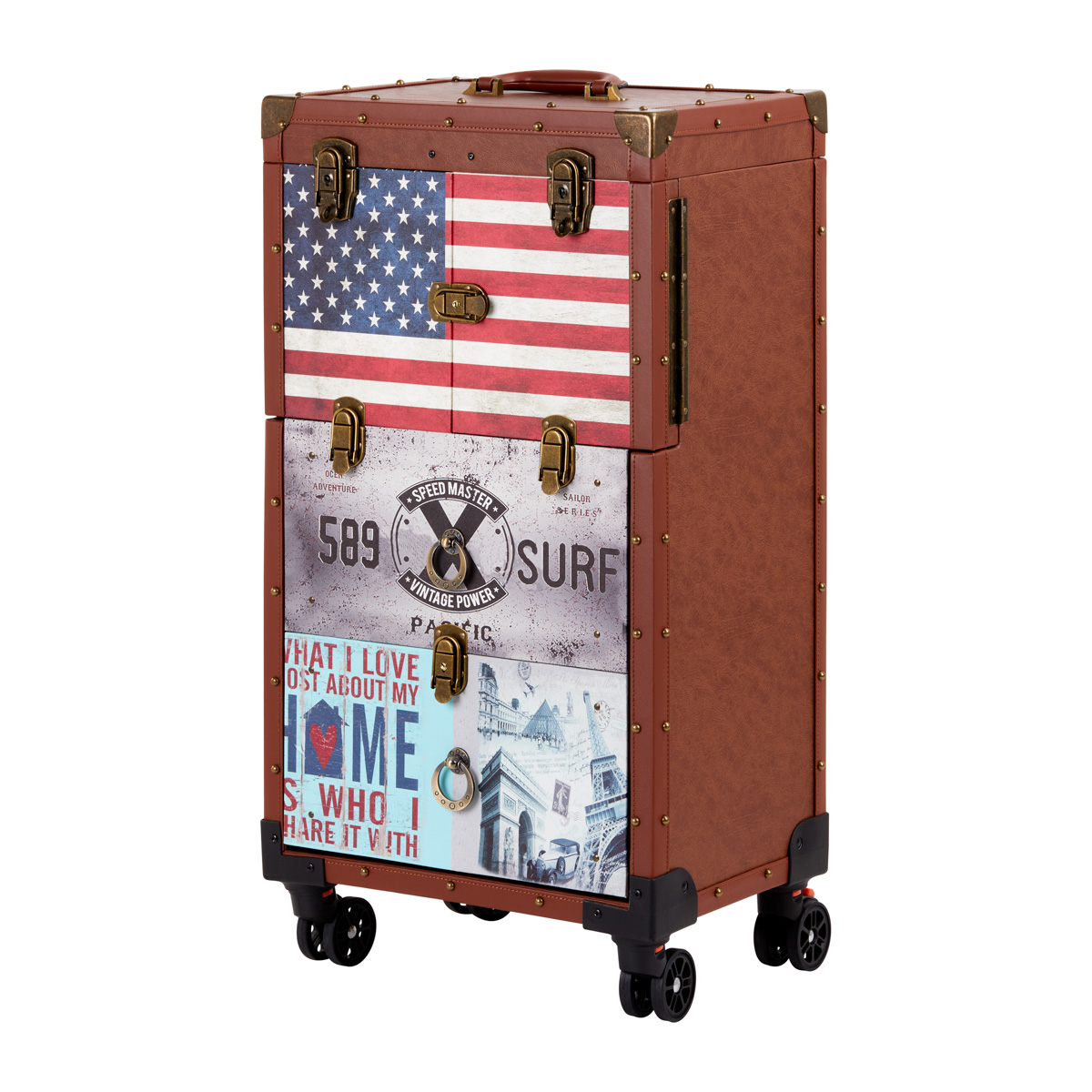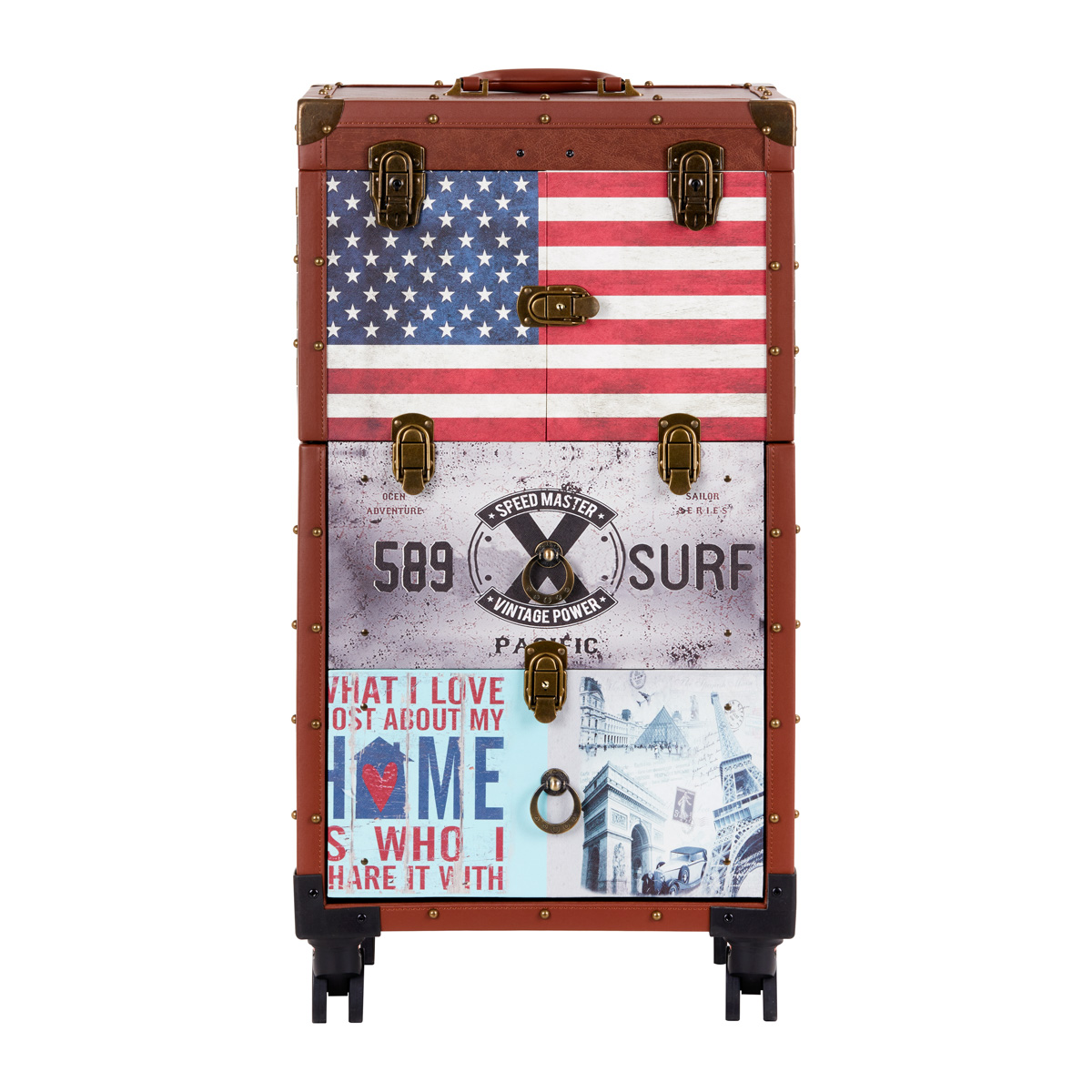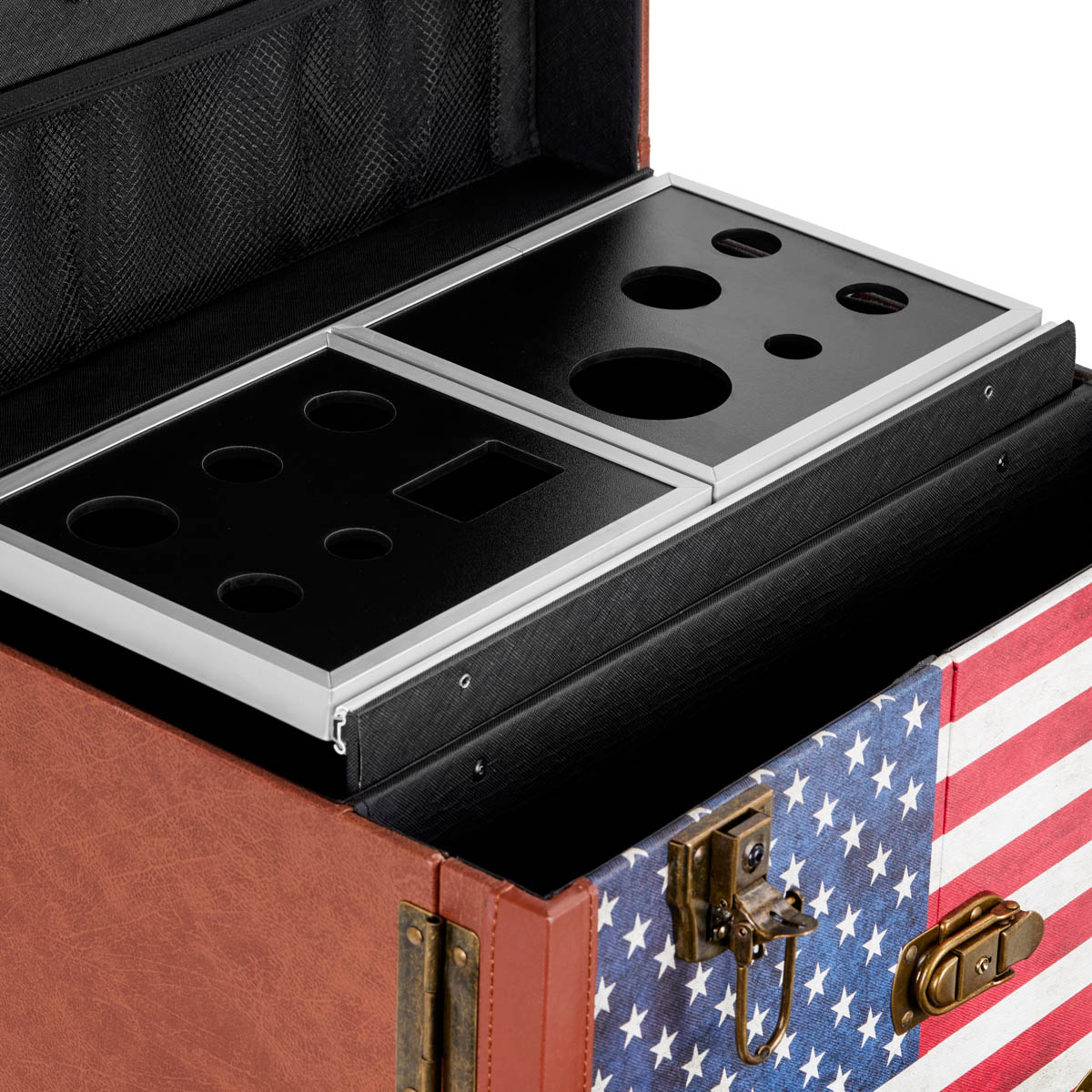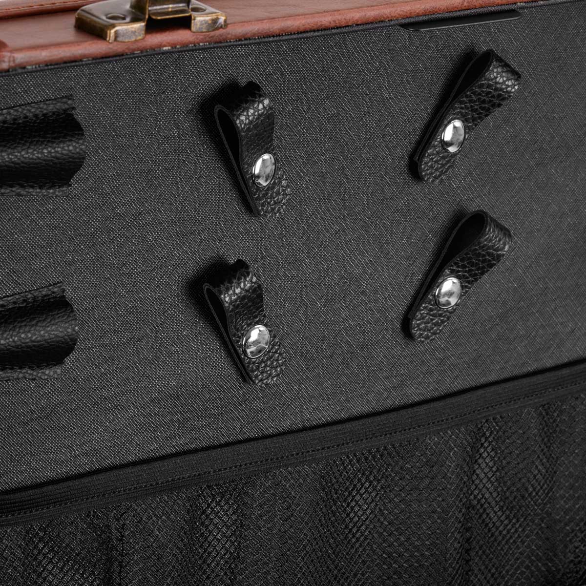 The characteristic style of the Gabbiano C12 helper is a the perfect solution for barbershops that appreciate the unique look and elegant details. The fronts of the cabinets are decorated with stylized American patterns, which will certainly emphasize the atmosphere of the interior. The material imitating leather in shades of brown and metal elements add elegance, masculine character and a luxurious look to the furniture. This helper will be a great choice for people who appreciate both interesting design and functionality.