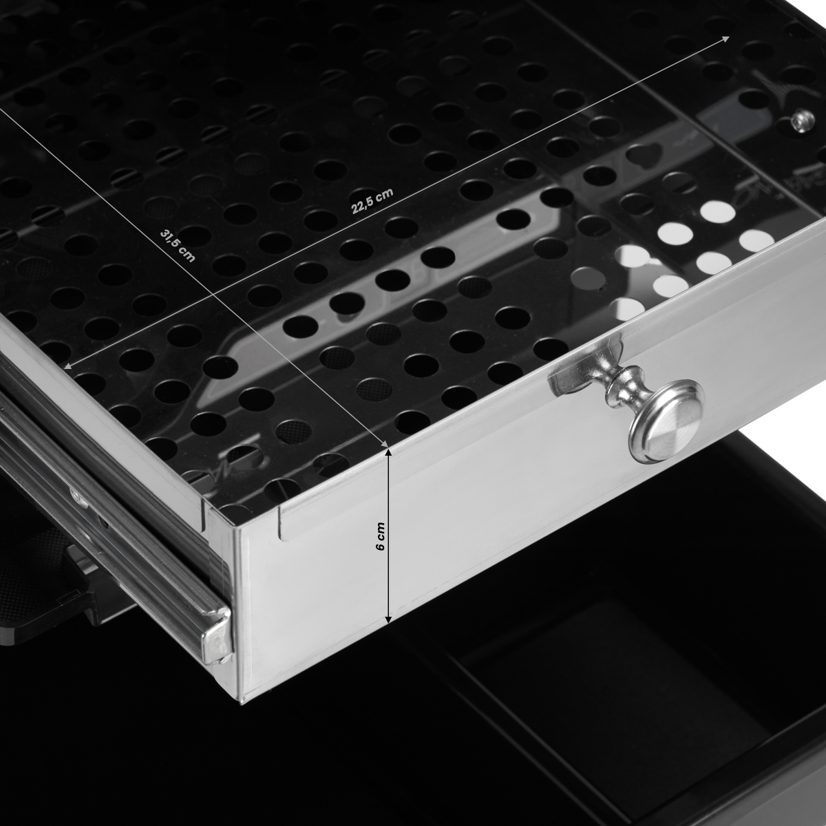 On top of the helper is a shallow recess, which will be great for putting away tools while you work. It will also be a great place to put the most necessary accessories for the duration of the service – as in the case of coloring – bowls, paints or brushes. The surface of the recess – like all the trays in the set – is covered with a matt, rough, non-slip layer, thanks to which it cushions and keeps the placed instruments in a given place.