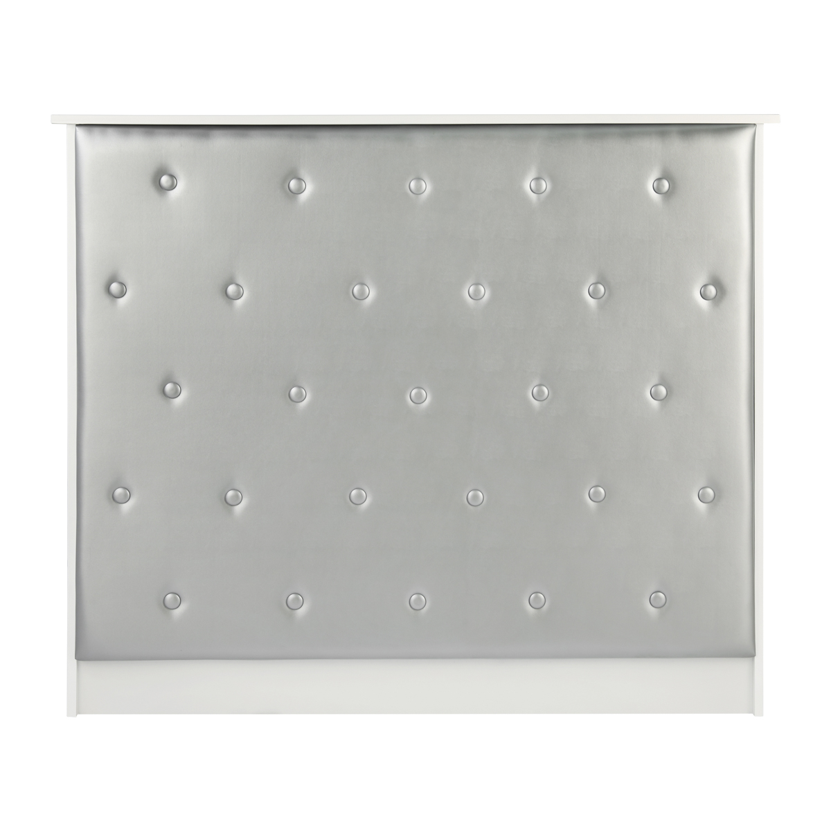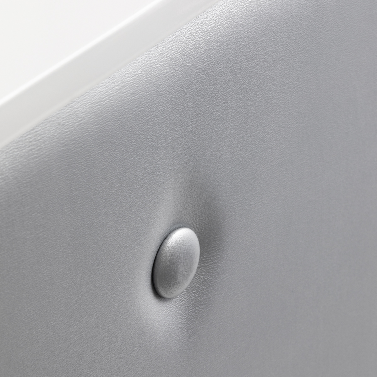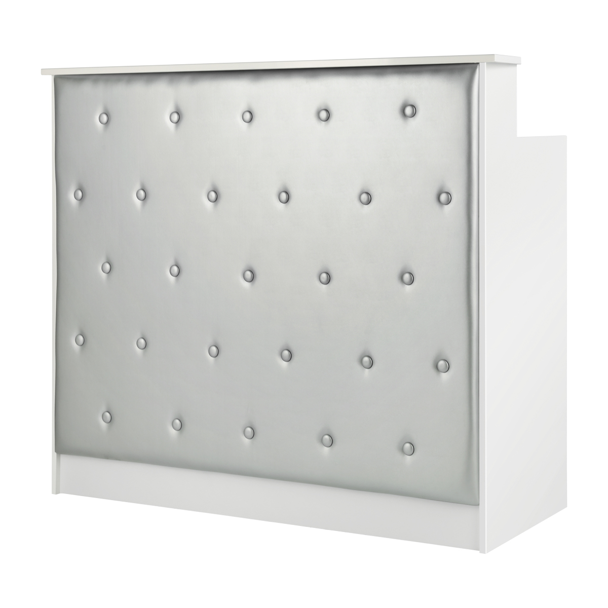 This piece of furniture is made of high-quality, durable laminated board in shades of white, and the smooth surfaces are easy to keep clean – in case of contamination, just wipe them with a damp cloth. The decorative front part has been upholstered with synthetic leather in shades of silver, which gives it a stylish look, ensures durability and ease of cleaning. Decorative buttons further add elegance and uniqueness, emphasizing the character of the interior. The reception desk was carefully made, it is stable, and the materials used allow for many years of effective use.