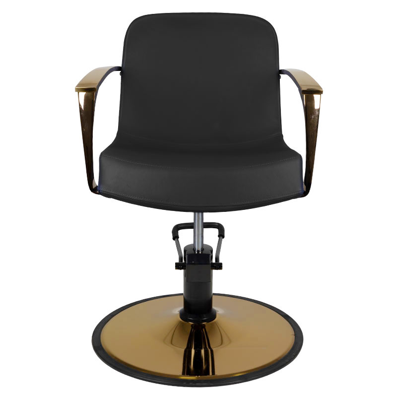 a modern hairdressing chair with a unique design and extraordinary quality. metal elements sparkle with a gold color, enhancing the sense of luxury. very comfortable, ideally suited to modern salons. specially contoured to provide the client with a comfortable position during the treatment. adjustable in the vertical plane. very stable and solid. upholstery made of high-quality eco-leather. black color.