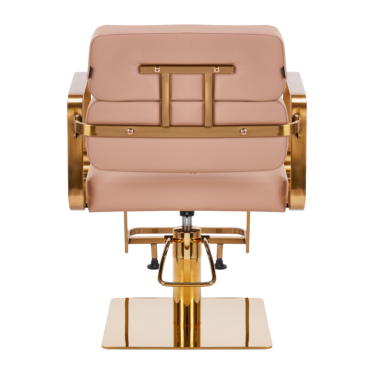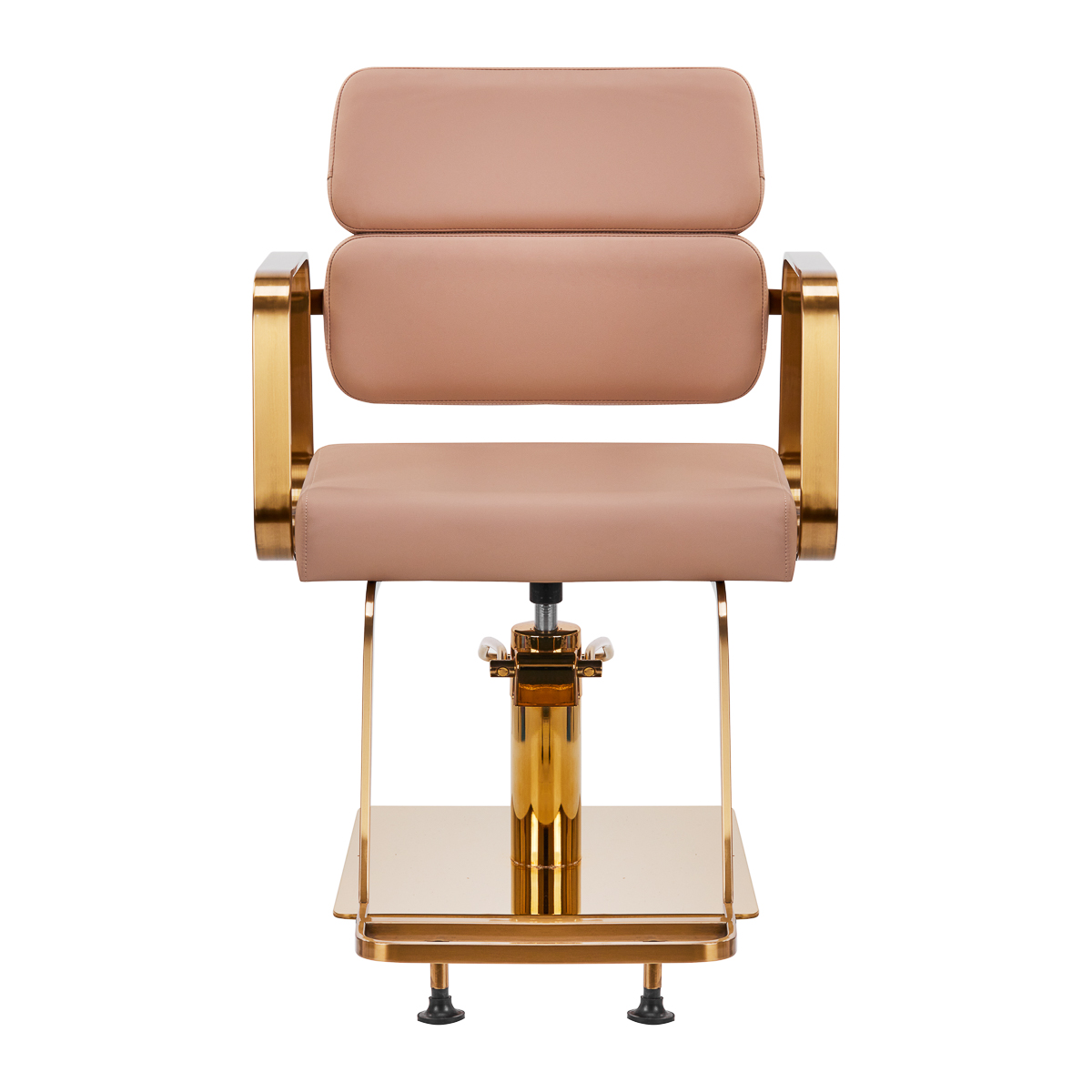 The full rotation mechanism of the chair makes the hairdresser's work more effective and comfortable. A solid, flat, square-shaped base guarantees stability during use. The matte-finished, smooth surface gives the element an elegant look and makes it easy to keep clean. A comfortable seat with foam filling ensures high comfort of use, even during many hours of treatments. Geometric, metal armrests in shades of gold allow for the correct positioning of the client's shoulders – this means that he does not bury his head in his shoulders or slouch – which makes it much easier to perform precise treatments, including haircuts. A stylish footrest dedicated to this model provides stable support for the user's feet.