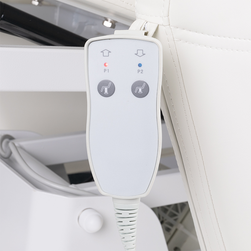 The chair has electric height adjustment, manual adjustment of the footrest and armrests and two foot switches for backrest and cradle adjustment. The solutions used make the chair extremely practical and the armrest is a very helpful solution not found in other chairs. In addition, it is equipped with a comfortable cushion for the client.