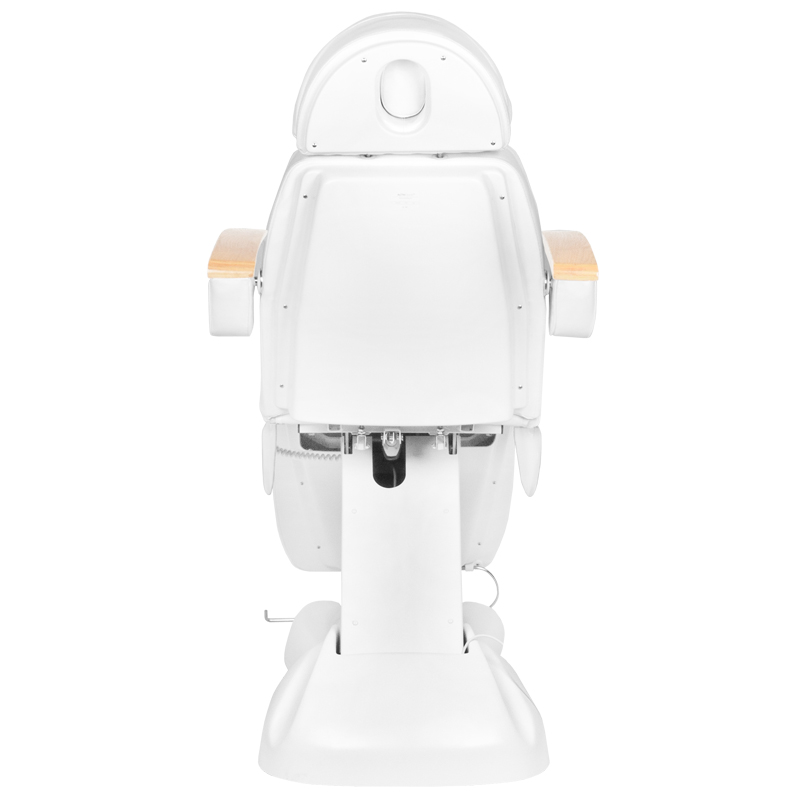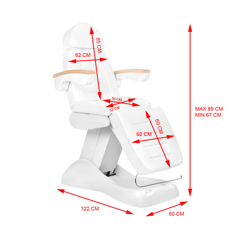 Full remote control makes the work easier. The seat cover is easily washable, made of eco-leather that meets the stringent EU requirements. In addition, the armrests are finished with wood, easily removable if necessary, and the hole in the headrest allows for massage. An additional advantage is a heated mattress, which allows for unusual relaxation for the client.