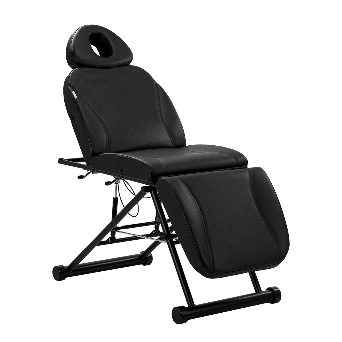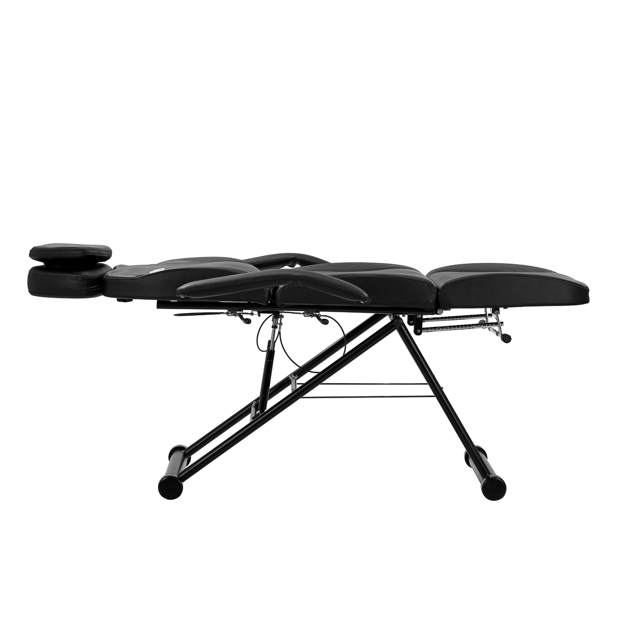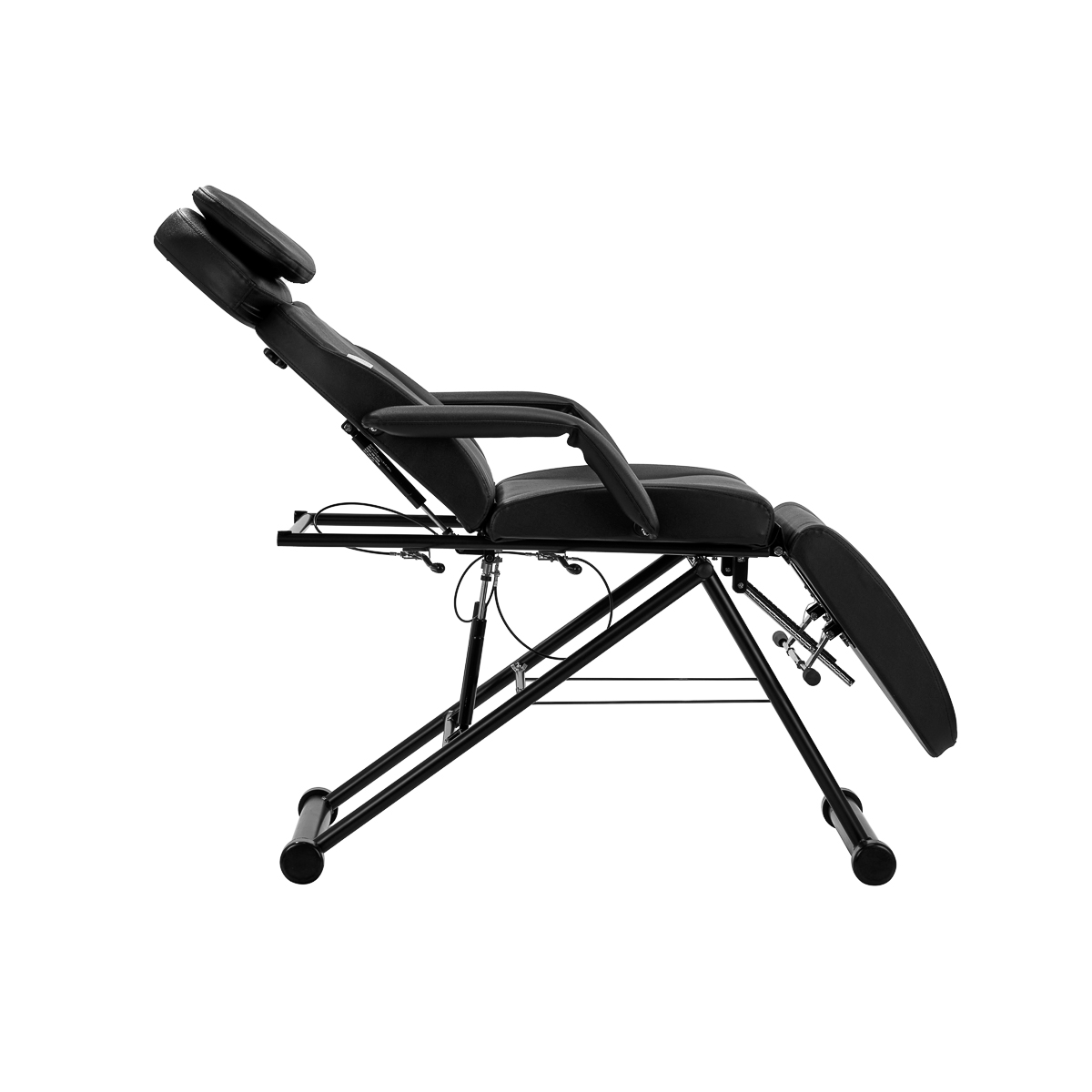 The base of the chair has a fixed height, so the seat is at a constant level, which should ensure comfort during use. The solid metal frame in shades of black provide the necessary stability during use. The headrest, which extends by about 15 cm, provides excellent head support, regardless of the customer's height. This allows you to freely perform various types of treatments, including cosmetology, physiotherapy and tattooing.