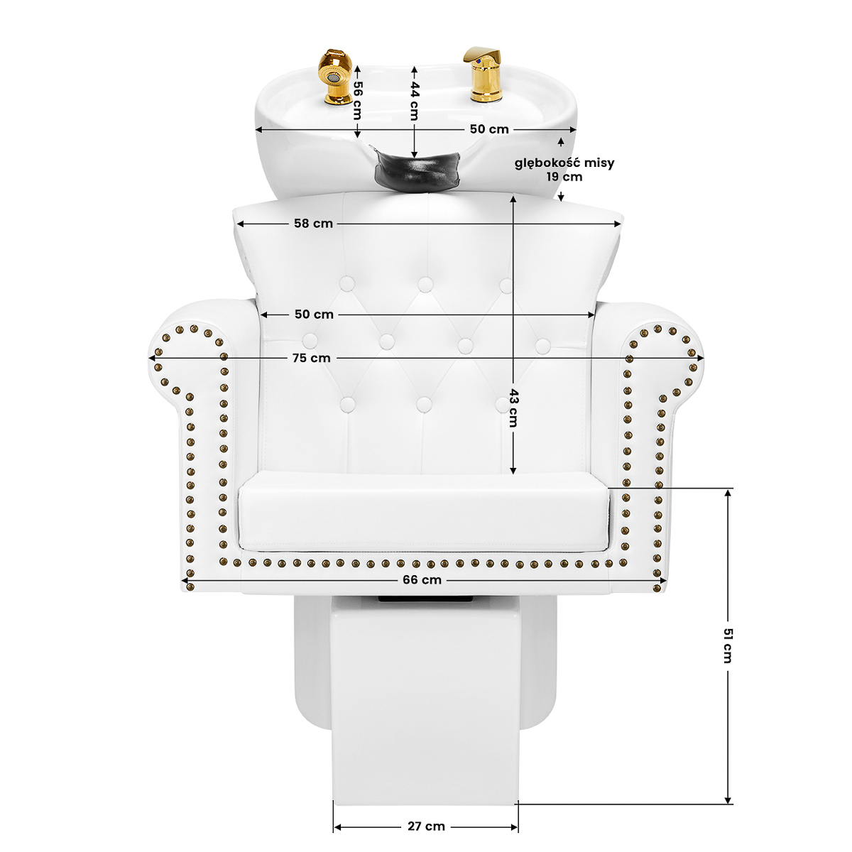 A properly profiled chair filled with durable foam provides adequate support and, therefore, high comfort of use. Armrests allow for the correct positioning of the client's shoulders. Pleasant-to-the-touch synthetic leather covering in shades of white ensures long-term durability and ease of cleaning. The original, elegant design of the hairdressing wash unit with decorative quilting and golden elements gives the interior a unique expression. The set includes complete fittings in shades of gold, including a faucet, a shower handset and dedicated hoses to provide a complete set of tools for work.