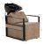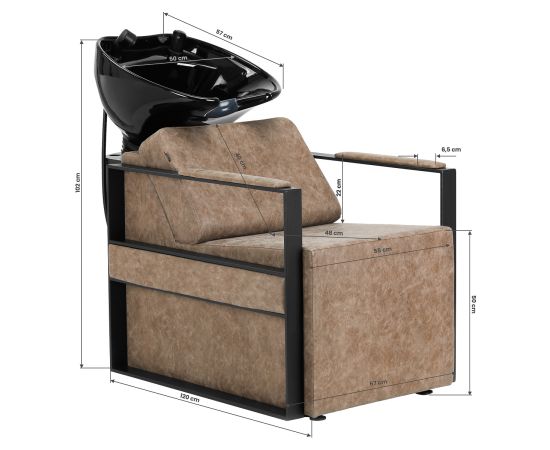 A properly profiled chair filled with durable foam ensures high comfort of use and geometric, partially upholstered armrests allow for correct positioning of the client's shoulders. The backrest is placed at an optimal angle and provides excellent support for the spine. Cover made of synthetic leather in shades of brown guarantees long-term durability and ease of cleaning. The original, elegant look of wash adds the interior's unique expression. Stabilization legs add stability and subtly emphasize the stylish character of the hairdressing wash unit. The set includes complete fittings with a matte finish in shades of black, including a faucet, shower head and dedicated hoses to provide a complete set of tools for work.