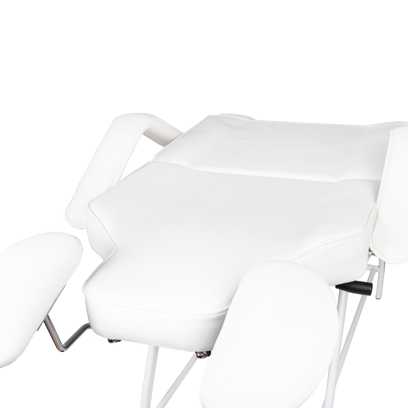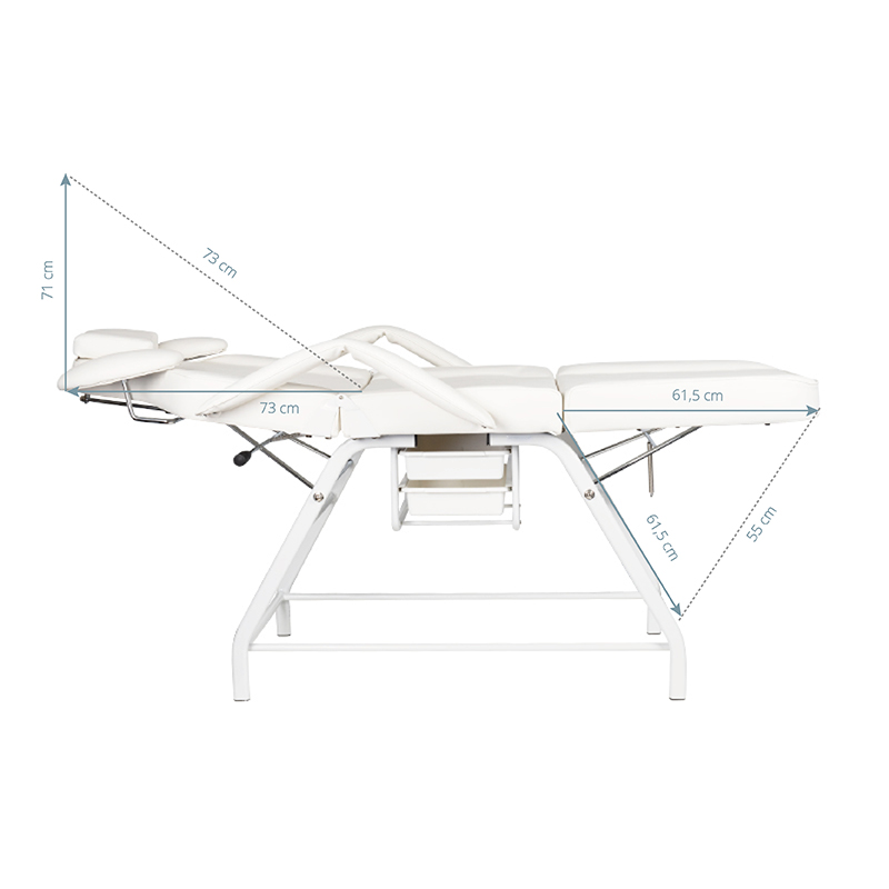 the chair has a manual adjustment of the footrest, backrest and arm support for the operator. the hand support used is an extremely practical solution not found in other armchairs. equipped with a comfortable pillow for the client and handy litter boxes for placing the necessary accessories.