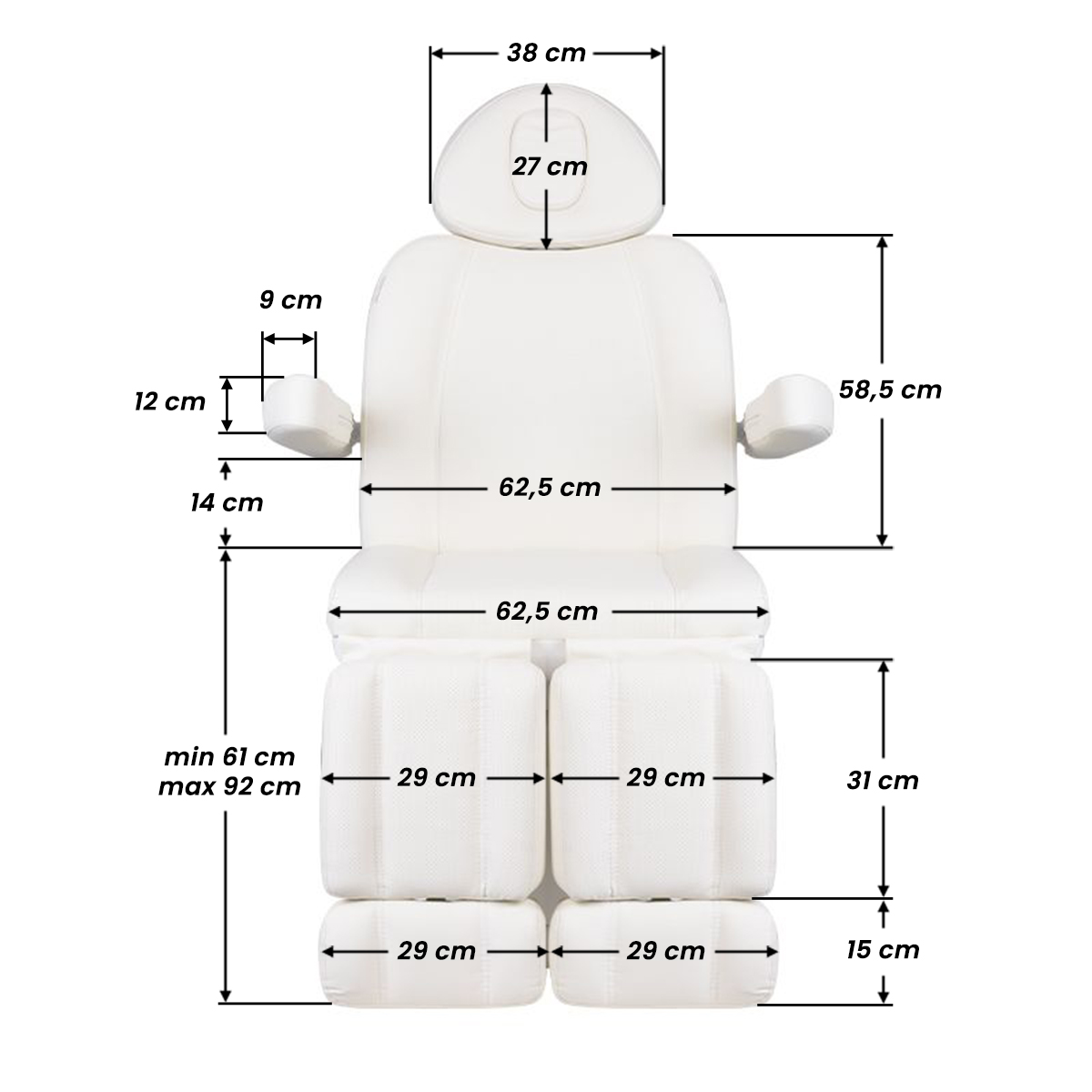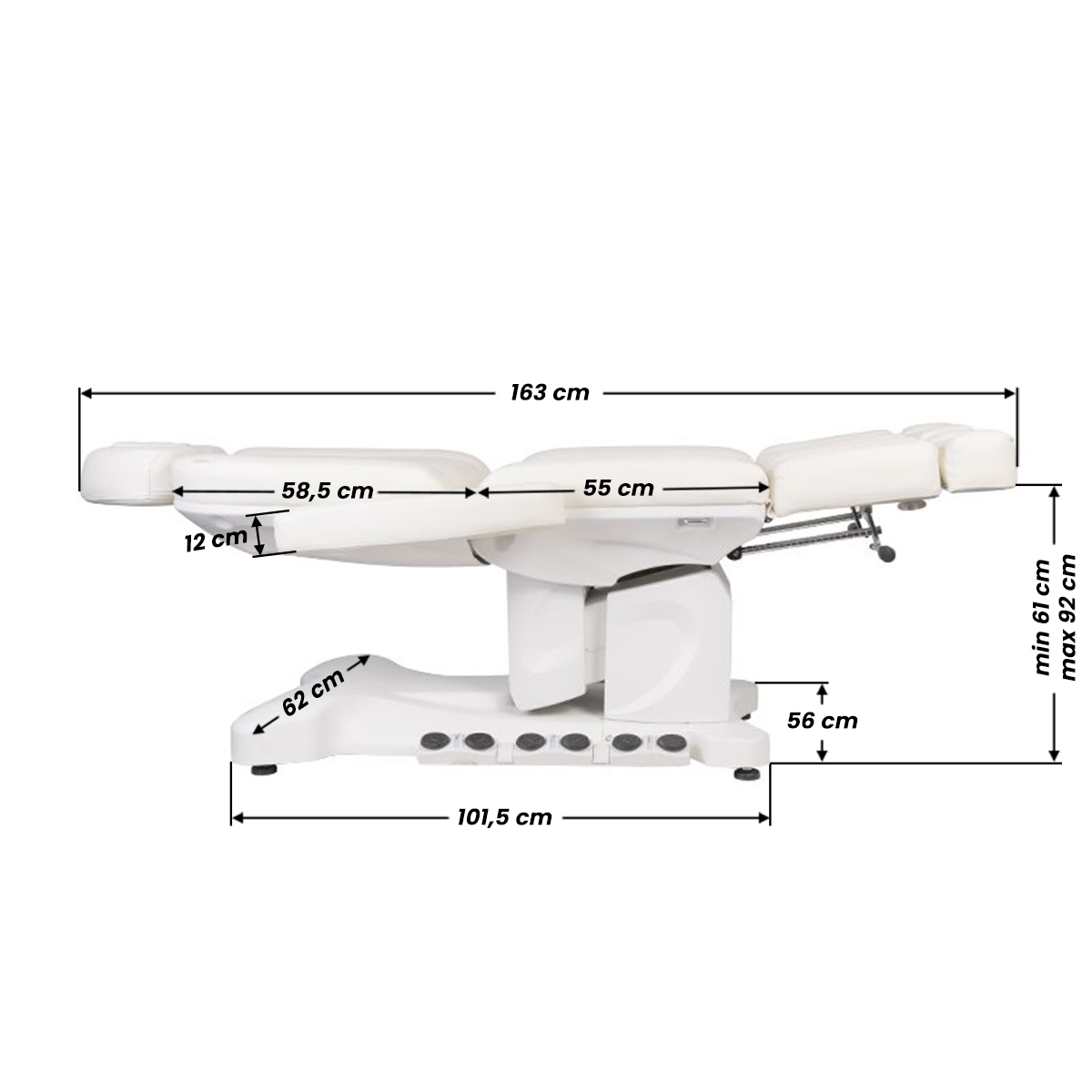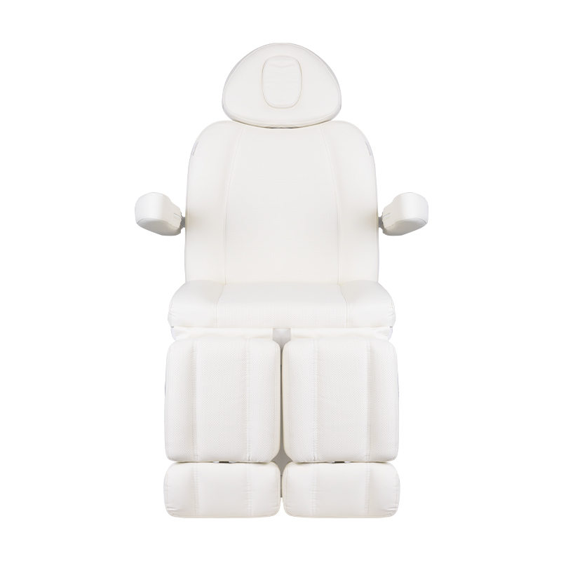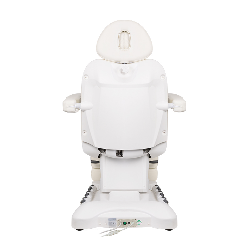 A unique electric cosmetic chair, ideally suited for beauty salons and SPA salons. Thanks to independent actuators, it allows you to adjust the chair in 3 planes by means of a remote control and foot switches, giving the possibility of comfortable pedicure treatments as well as face and body treatments. By using the remote control, we can use the programmed settings and start the HOT function, i.e. heating. The armchair uses perforated upholstery, unheard of in other armchairs, and colored LED illumination of the base.