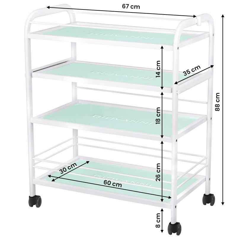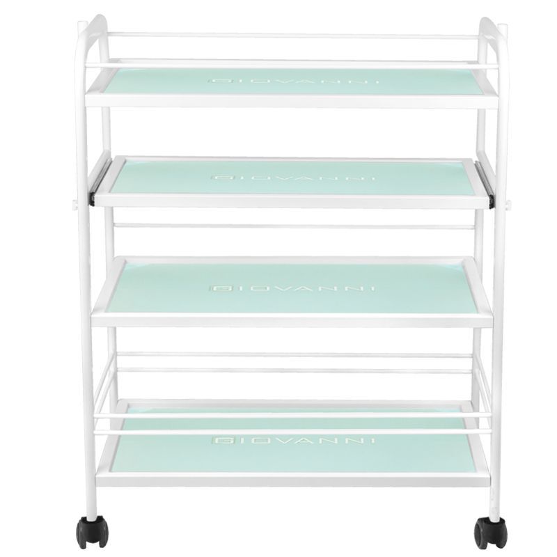 aesthetic table for a cosmetic device, made of metal and glass, with wheels. has four glass shelves.