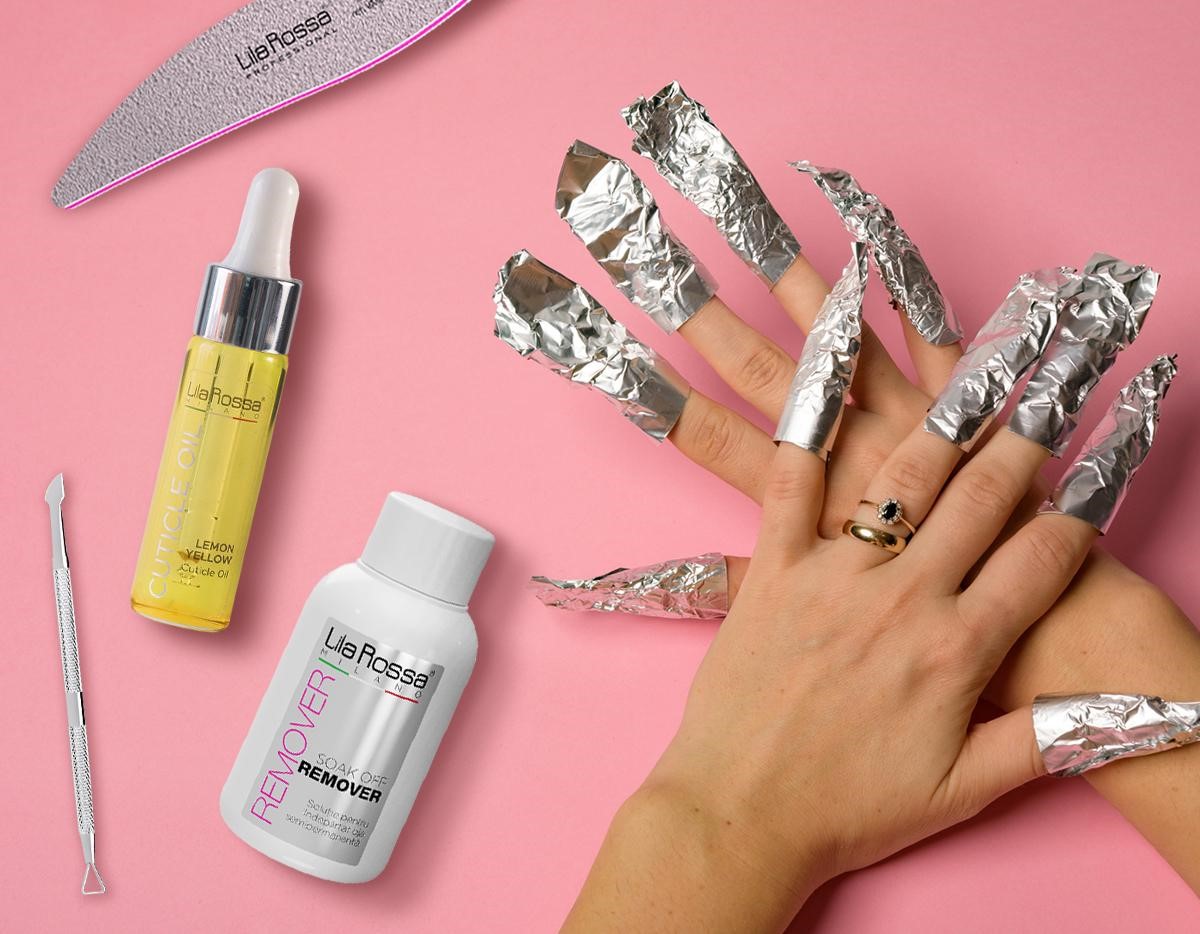 Πάνω από τους δίσκους καθαρισμού, που κόβουμε σε αρκετά μικρά κομμάτια για να καλύψουμε τα νύχια, εφαρμόζουμε remover ή ασετόν. Τα τοποθετούμε σωστά στα νύχια και τα τυλίγουμε με αλουμινόχαρτο ή τα πιάνουμε με κλιπ.