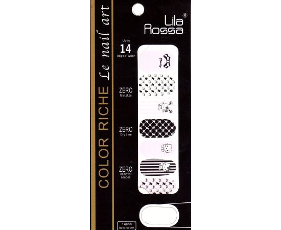 Ένα φύλλο αυτοκόλλητου περιέχει 14 σχέδια που μπορούν να χρησιμοποιηθούν τόσο στο φυσικό νύχι όσο και στο τεχνικό νύχι και στερεώνονται πολύ εύκολα σε κλασικό βερνίκι .