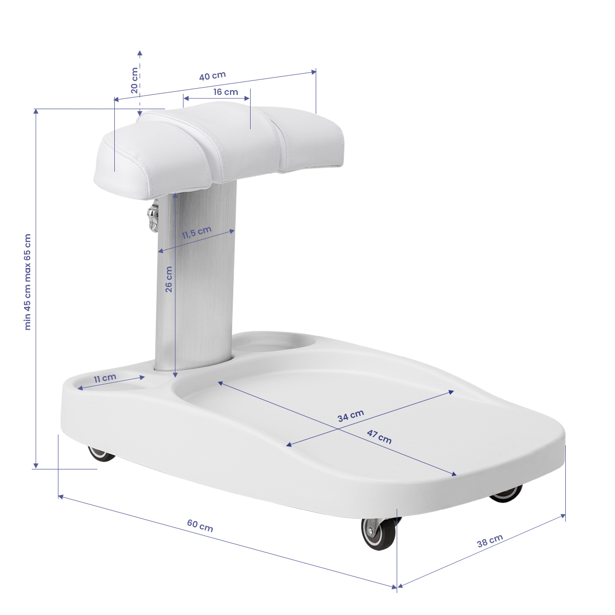 The footrest is made up of three parts, of which the middle one is extendable. Manual height adjustment allows it to be raised by a maximum of 20 cm. All elements of the footrest are upholstered with synthetic leather, which ensures resistance to moisture and ease of cleaning. As a result, the trolley can be adjusted to the individual needs of the user, which makes it an excellent solution for both cosmetic and podiatric treatments, ensuring comfort and precision of work in various positions.