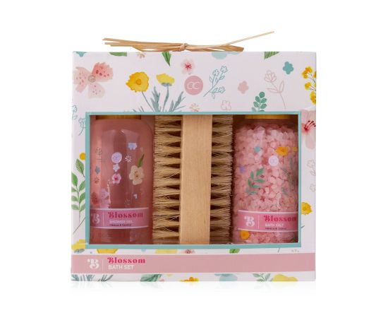 Σετ δωρου γυναικειο, αφρόλουτρο, άλατα μπάνιου, Βούρτσα νυχιών, Bath set BLOSSOM in gift box, 100ml shower gel, 100g bath salt, nail brush, fragrance: Hibiscus & Coconut, col. white/light pink/yellow, σετ δωρο πάσχα