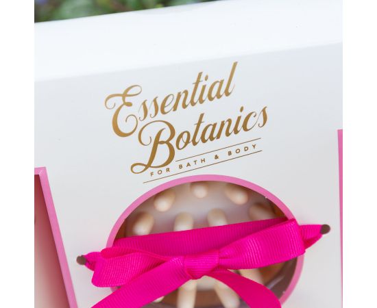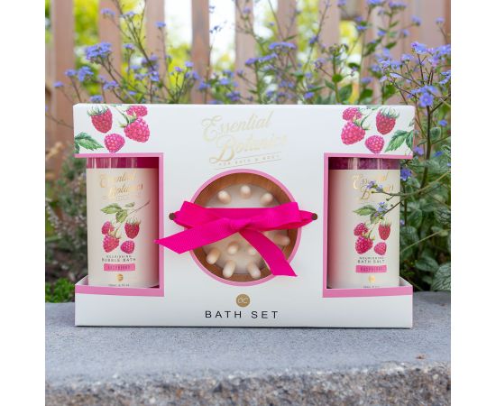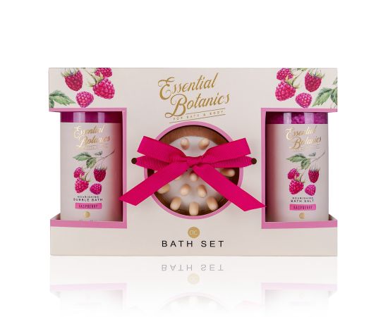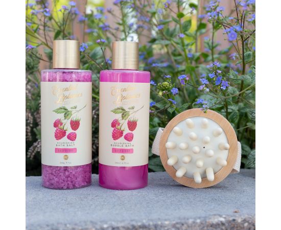 Σετ δωρου γυναικειο, αφρόλουτρο, αφρός μπάνιου, άλατα μπάνιου, Βούρτα για μασάζ, Bath set ESSENTIAL BOTANICS - FRUITS in paper gift box, 200ml bubble bath, 260g bath salt, massage brush, design/fragrance: Raspberry, σετ δωρο πάσχα