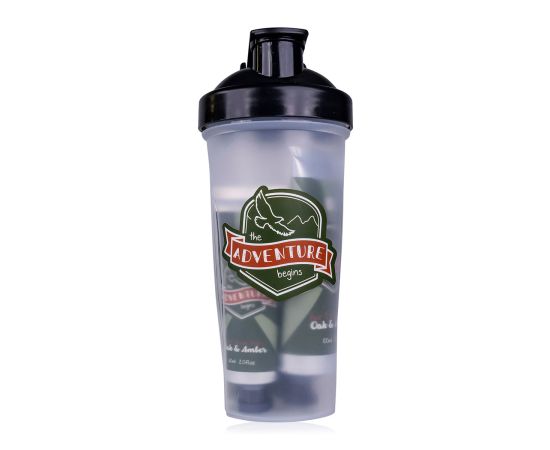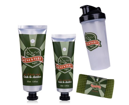 Σετ περιποίησης ανδρών, αφρόλουτρο, βάλσαμο για μετά το ξύρισμα, πετσέτα, Bath set ADVENTURE COLLECTION in drinking bottle (ca. 600ml, also suitable for Protein Shakes etc.), 100ml hair & body wash, 60ml after shave balm, towel (30 * 30cm), fragrance: Oak