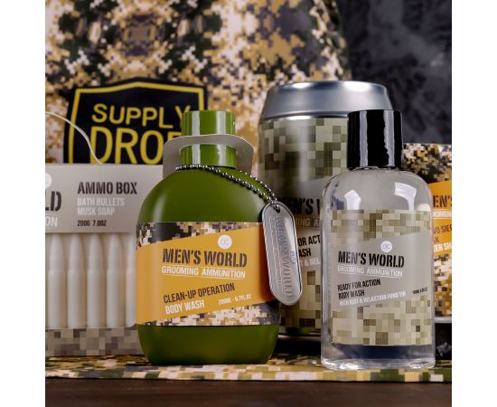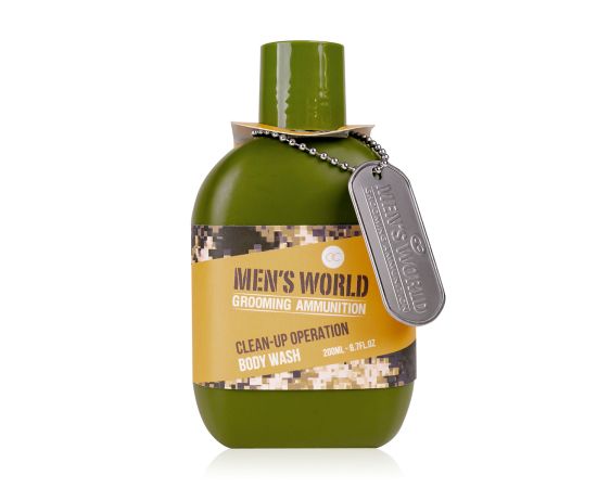 Σετ περιποίησης ανδρών, αφρόλουτρο, 200ml body wash MEN'S WORLD in bottle, inkl. dog tag, fragrance: Oak & Amber, col.: olive green/ochre/orange, σετ δώρο Πάσχα