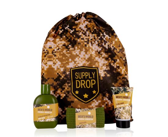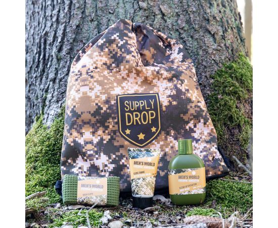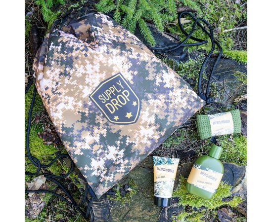 Σετ περιποίησης ανδρών, αφρόλουτρο, after shave , πετσέτα, Bath set MEN'S WORLD in Gym Bag with camouflage print, 200ml body wash, 75ml after shave balm, 30 * 30cm towel, fragrance: Oak & Amber, col.: olive green/ochre/orange, σετ δώρο Πάσχα