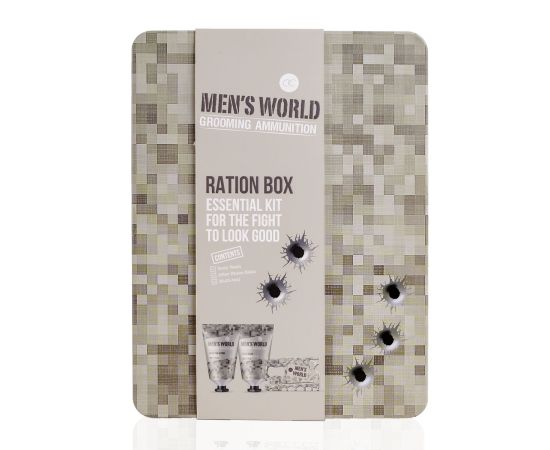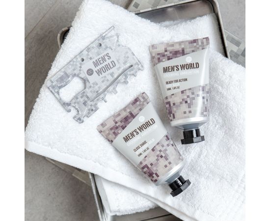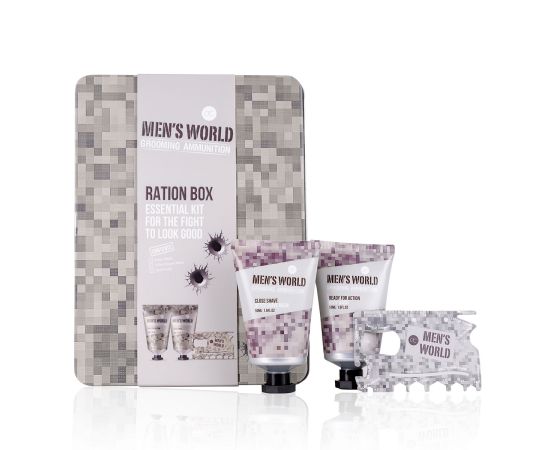 Σετ περιποίησης ανδρών, αφρόλουτρο, after shave , multi-tool, Gift set MEN'S WORLD in tin box, 50ml body wash, 50ml after shave balm, multi tool, fragrance: Oak & Amber, col.: cream/brown/grey, σετ δώρο Πάσχα