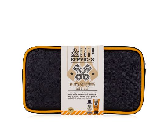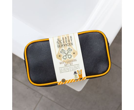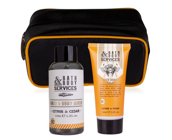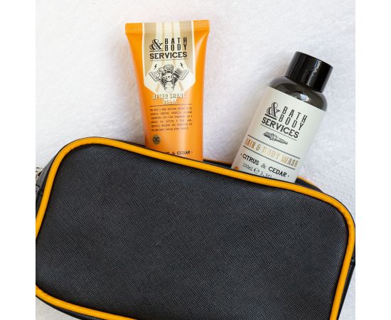 Σετ περιποίησης ανδρών, αφρόλουτρο, βάλσαμο για μετά το ξύρισμα, Bath set BATH & BODY SERVICES in wash bag, 100ml hair & body wash, 60ml after shave balm, fragrance: Citrus & Cedar, col. beige/orange/black, σετ δώρο Πασχα