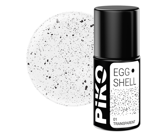 Το ημιμόνιμο βερνίκι νυχιών Egg Shell είναι ένα πολύ ευέλικτο προϊόν με μεσαίο ιξώδες, διάφανο, με πολλές μικρές μαύρες κουκκίδες στο εσωτερικό του. Μπορεί να χρησιμοποιηθεί ως βερνίκι νυχιών ή μπορείτε να δημιουργήσετε διάφορα σχέδια. Μπορεί να εφαρμοστεί σε οποιοδήποτε βερνίκι gel, δομικό gel ή ακρυλικό. Πολυμερίζεται κάτω από τη λάμπα UV/LED 120/60 δευτερόλεπτα.