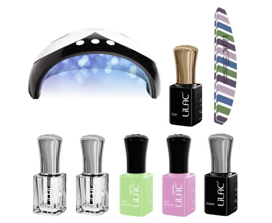 - Απλώστε μια στρώση ημιμόνιμο βερνίκι νυχιών Lilac, πολυμερίστε 60/120 δευτερόλεπτα στη λάμπα LED/UV.